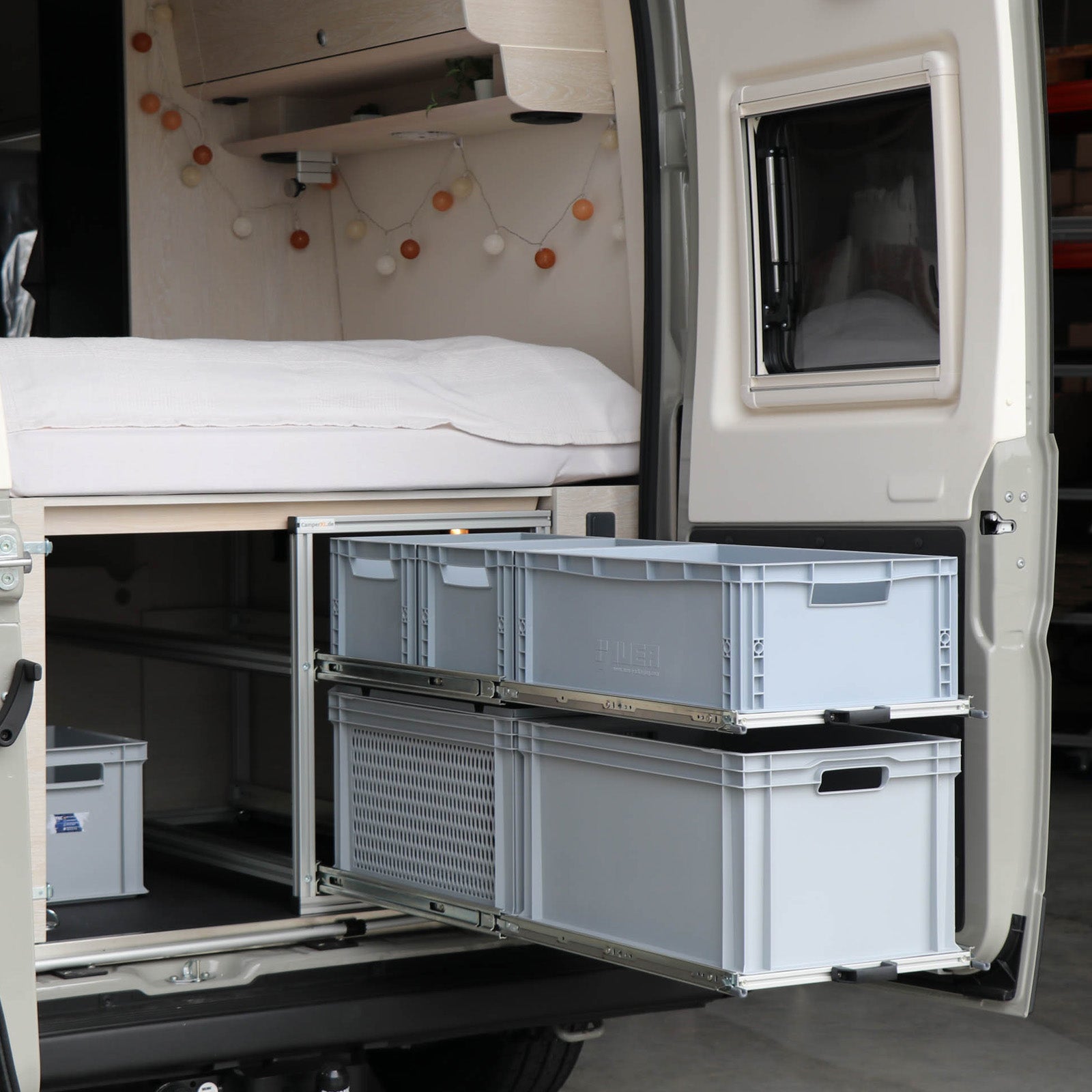 Unsere Heckauszüge – ob einfach, mit Ablage, mehrstöckig oder als Selbstausbau-Set – sind perfekt auf Euroboxen abgestimmt. Du bekommst sie versandfertig oder mit Einbau direkt in unserer Werkstatt in Bensheim.