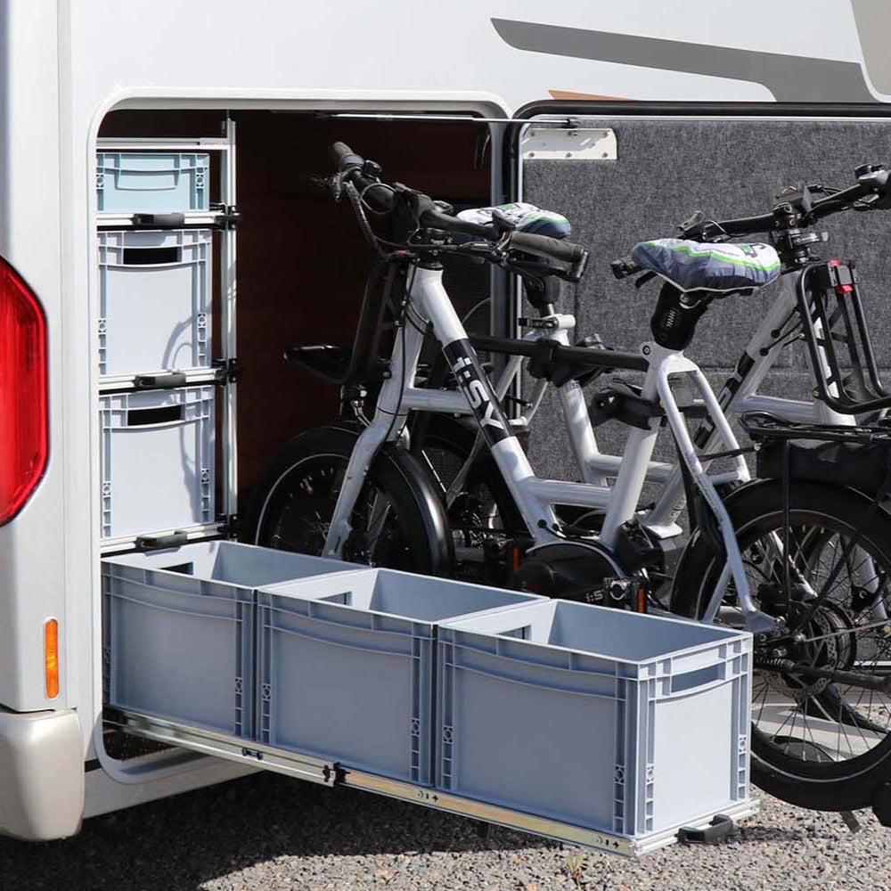 Das Regal mit einzeln ausziehbaren Etagen in der Heckgarage ermöglicht jederzeit Zugriff auf alle Boxen. Möbel, Vorzelt und Ausrüstung werden darum herum platziert, sodass nichts umgeräumt werden muss. Ideal für Ordnung und schnellen Zugriff beim Campen.