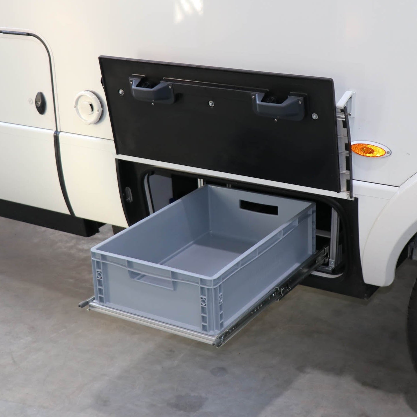 In einem Hymer-Wohnmobil wurde ein praktisches Regal mit vier stabilen Vollauszügen montiert – ideal für geordneten Stauraum. Ergänzt wird der Ausbau durch einen flachen Doppelbodenauszug, perfekt für sperrige oder flache Gegenstände. Ideal für mehr Ordnung und Komfort auf Reisen.