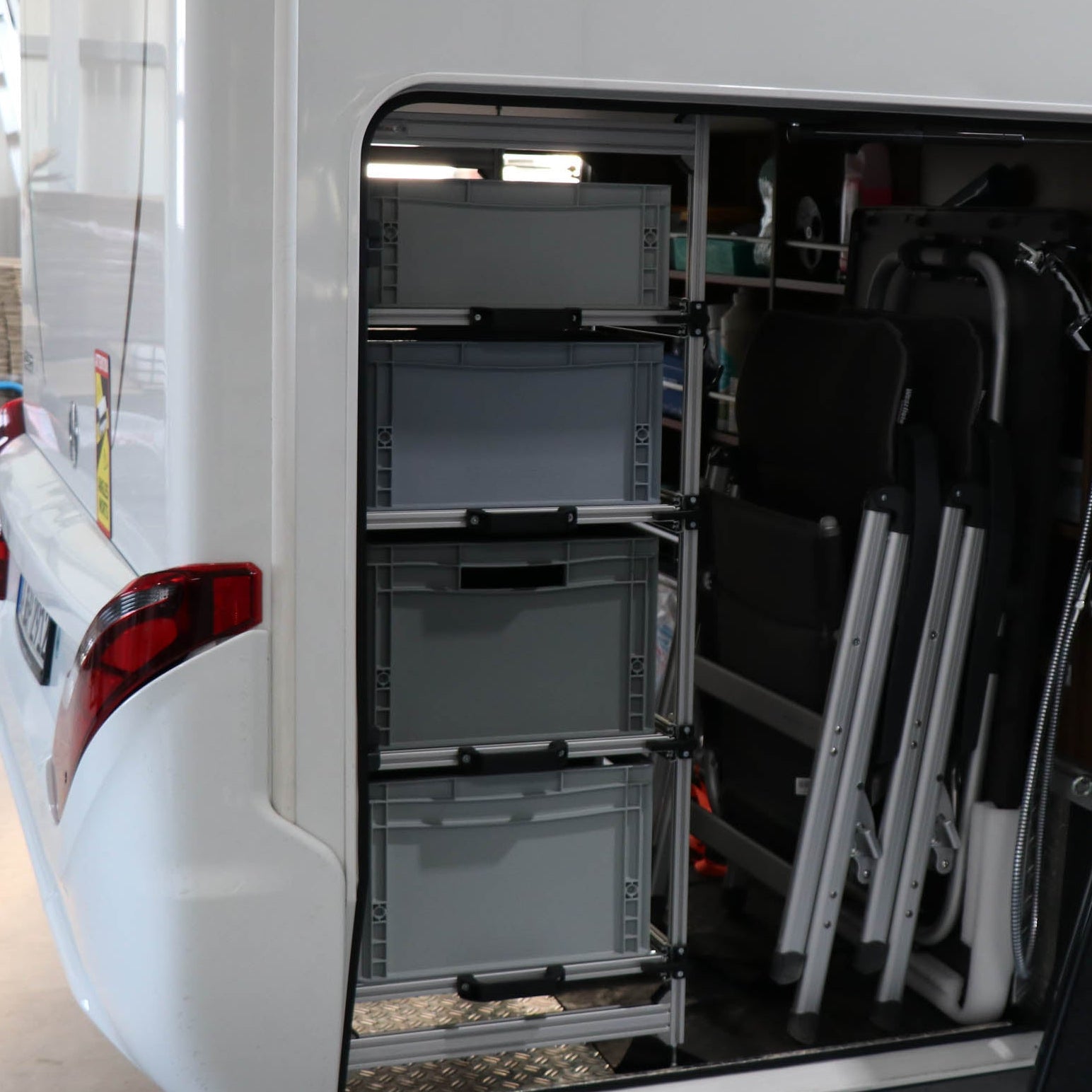 Passgenaues Auszugsregal aus Aluminium für die Heckgarage des Hymer B 780. Das Regal wird auf der rechten Seite zum Wohnraum hin montiert und bietet auf vier Ebenen Platz für Euroboxen. Die oberen drei Etagen sind voll ausziehbar und ermöglichen schnellen Zugriff von außen, ohne in die Garage zu steigen.