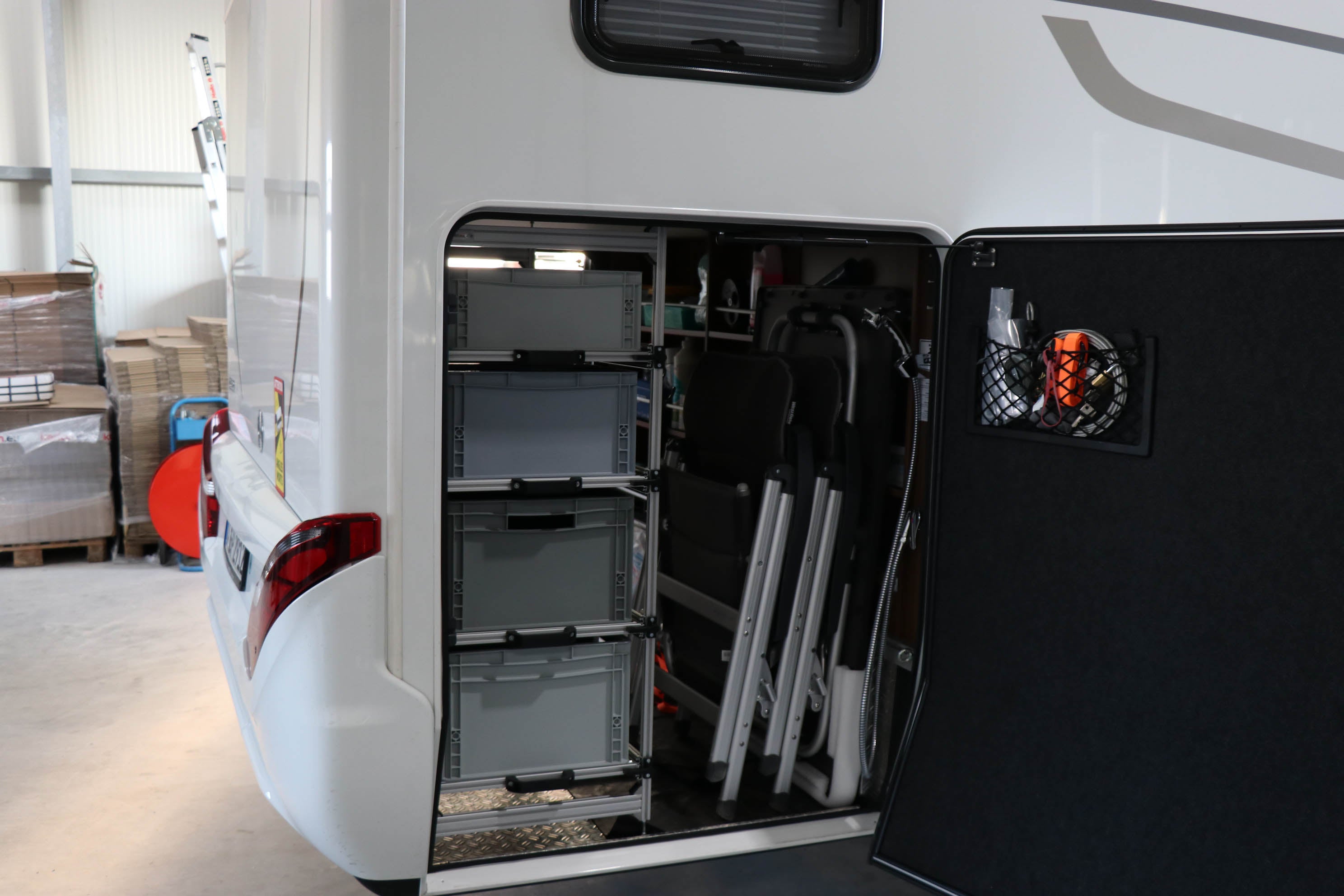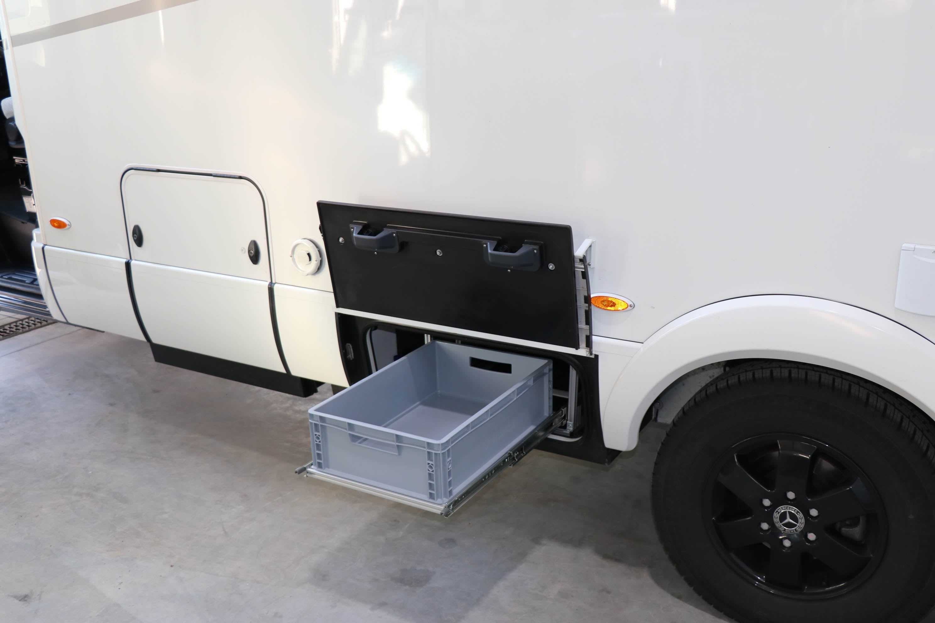 In einem Hymer-Wohnmobil wurde ein praktisches Regal mit vier stabilen Vollauszügen montiert – ideal für geordneten Stauraum. Ergänzt wird der Ausbau durch einen flachen Doppelbodenauszug, perfekt für sperrige oder flache Gegenstände. Ideal für mehr Ordnung und Komfort auf Reisen.