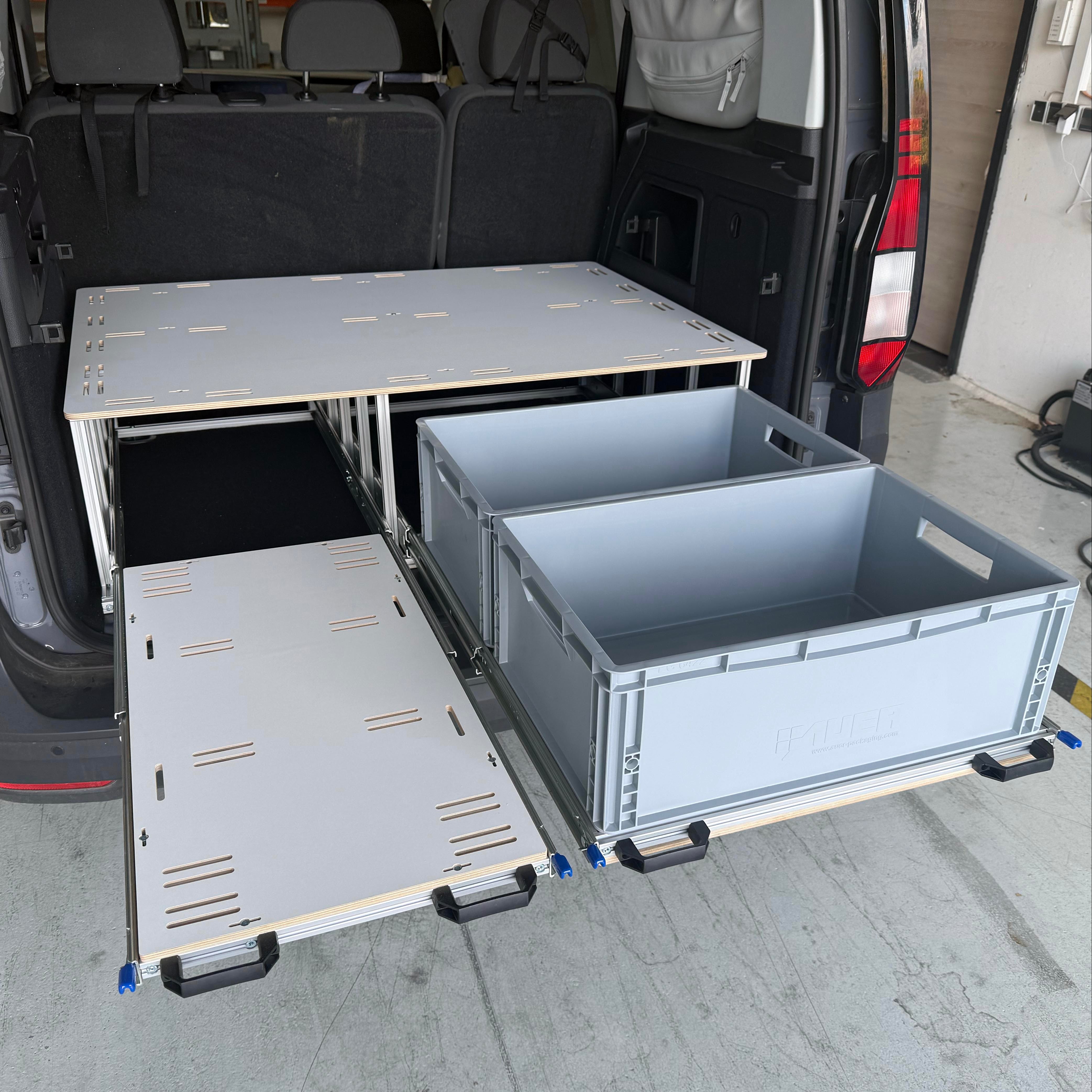 Zweistöckiger Auszug: Die untere Ebene dient als stabiler Grundauszug, während die zweite Etage als Plattformauszug ausgeführt ist und mit unserem vielseitig einsetzbaren Multiboard ausgestattet wurde – ideal für Campingmöbel etc..